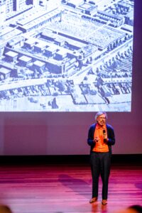 De inbreiende stad was ook het thema van gastprogrammamaker Violette Schönberger waarmee we in 2022-2023 een groot aantal bijeenkomsten vormgaven. Haar programma heette ‘gezonde verdichting’. In haar optiek is de stad – en zeker een gezonde stad – méér dan een serie van technische en ruimtelijke oplossingen. De stad is volgens haar juist een cultureel geheel, waarbinnen een cultureel-ruimtelijke ervaring, gedeelde belevingen van bewoners en de poëtische kant van gebouwen en de waarden die zij vertegenwoordigen een grote rol spelen. In haar lezingen ging ze in op de vraag wat verdichting betekent voor de beleving van de inwoners van de stad, en dan in het bijzonder voor Eindhoven? Hoe kunnen we ervoor zorgen dat een verdicht Eindhoven ook een beter, gezonder Eindhoven wordt? In haar afsluitende essay concludeerde dat de vraagstukken waar een stad als Eindhoven voor staat niet kunnen worden opgelost met de geijkte methoden. Er is volgens haar ‘enige mate’ van systeemverandering nodig: