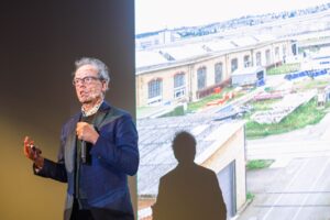Architect Winy Maas was diverse keren te gast bij het centrum, hier in 2018 op het VDMA-terrein